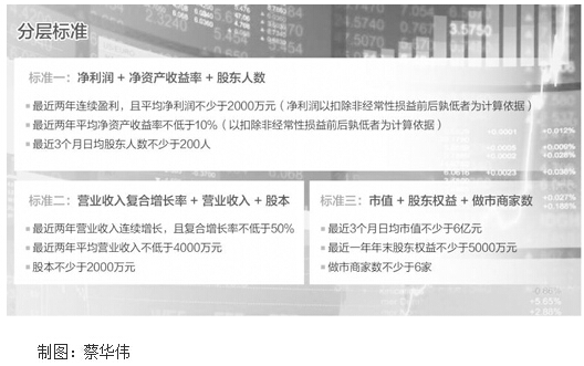 根据方案,标准一为“净利润+净资产收益率+股东人数”。具体而言,一是最近两年连续盈利,且平均净利润不少于2000万元(净利润以扣除非经常性损益前后孰低者为计算依据);二是最近两年平均净资产收益率不低于10%(以扣除非经常性损益前后孰低者为计算依据);三是最近3个月日均股东人数不少于200人。标准二是“营业收入复合增长率+营业收入+股本”。标准三是“市值+股东权益+做市商家数”。
