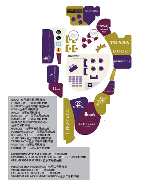 请注意:文中平面图旨在反映出每一类旅客的不同喜好。尽管可能并非本分之百地表现出实际情况,但对希思罗机场各航站楼提供的各家商店和各项服务都进行了很好的展示,通过这些可以知道在机场何处找到目标商店和服务。
