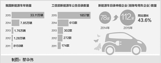 这只是2015年中国新能源汽车市场爆发式增长的一个缩影。中汽协统计显示,去年,我国新能源汽车销售33.11万辆,同比增长3.4倍。其中纯电动汽车销售24.75万辆,同比增长4.5倍;插电式混合动力汽车销售8.36万辆,同比增长1.8倍。