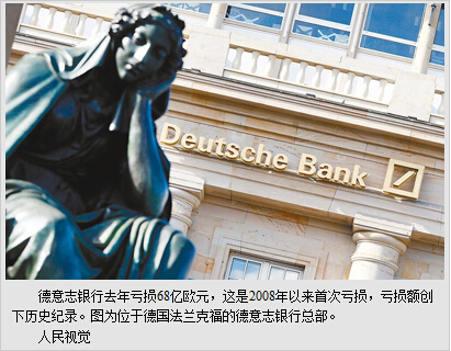 截至今年1月底的半年时间里,欧洲银行业市值蒸发4000亿欧元,比希腊经济体量的两倍还多。特别是今年以来,德意志银行的股价下跌了30%多,尤其是1月底到2月上旬,德意志银行财报披露去年共亏损68亿欧元,超过预期。