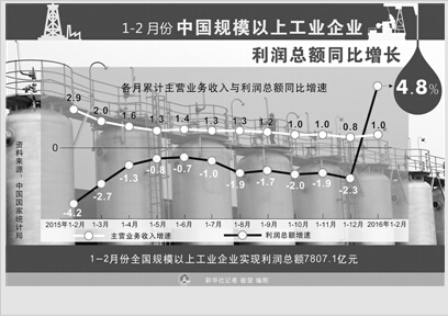 国家统计局3月27日公布,今年1—2月份,全国规模以上工业企业实现利润总额7807.1亿元,新增利润355.4亿元,同比增长4.8%,改变了2015年全年利润下降的局面。