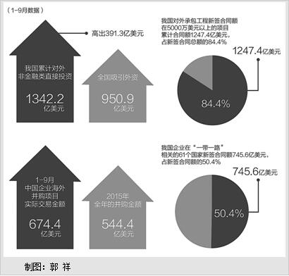 “快速增长是2016年中国对外投资的主旋律。”沈丹阳说,1—9月,我国对外非金融类直接投资较同期全国吸引外资(950.9亿美元)高出391.3亿美元。