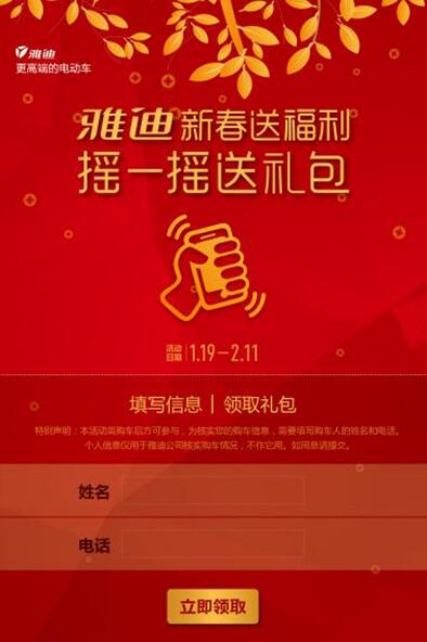 据悉,雅迪打造如此大幅度的红包福利,旨在让广大消费者通过 “摇一摇”,在鸡年春节期间,感受全民娱乐购物,辞旧迎新之际,为大家的新春添彩。
