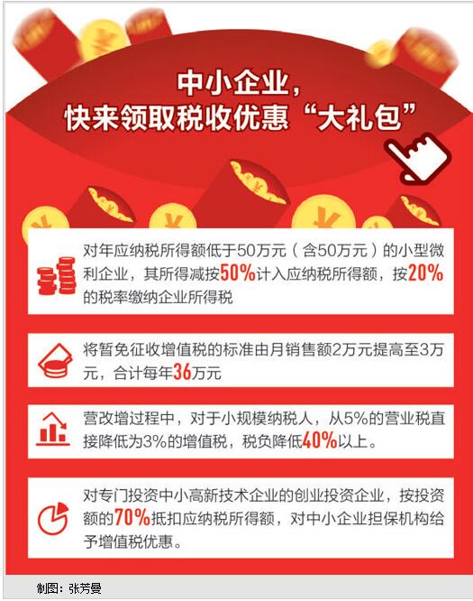 比如,就小微企业而言,除了将所得税优惠政策提高到50万元外,我国还将暂免征收增值税的标准由月销售额2万元提高至3万元,合计每年36万元。营改增过程中,年销售额不超过500万元的中小企业,可以认定为小规模纳税人,从5%的营业税直接降低为3%的增值税,税负降低40%以上。