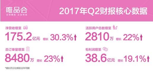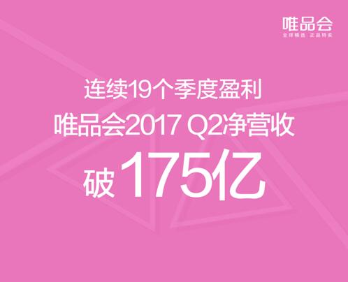 北京时间2017年8月17日,特卖电商唯品会(vip.com,NYSE:VIPS)公布了截至2017年6月30日未经审计的第二季度财务报告。财报显示,唯品会总净营收为175.2亿元(约合25.8亿美元),较上年同期的134.4亿元增长30.3%,实现连续19个季度盈利。