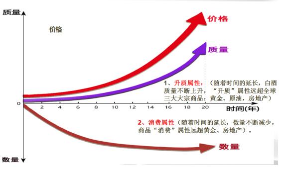 由上图可以看出,中国白酒商品的时间价值投资属性分为增值属性与消耗属性,这是其他商品如房子、原油、黄金、有色金属、大豆、农产品、还有电器商品、手机商品……等都无法具备的商品根本属性,直观说就是中国传统白酒具有的时间属性可通过时间创造财富。