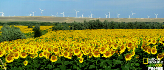 刘占崑点评:以大片的向日葵作为照片的前景,同时呈现了远处数不清的风能发电机,整个照片视野开阔,色彩绚丽,蓝、白、黄、绿四色搭配和谐,向日葵和风能发电机融合得相得益彰,表现了风能(环保事业)在人们生活中的运用及拍摄者对美好生活的向往。