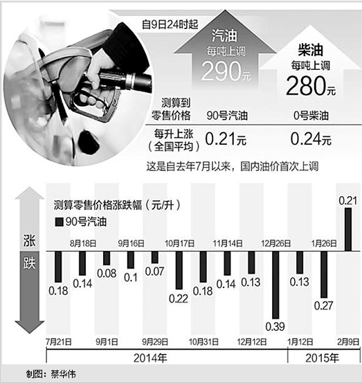 国家发改委的通知说,此次成品油价格调整幅度,是按照现行成品油价格形成机制,根据2月9日前10个工作日国际市场原油平均价格变化情况计算确定的。1月下旬以来,受国际石油企业宣布减少投资等因素影响,国际市场油价震荡上行,前10个工作日平均价格有所上涨。