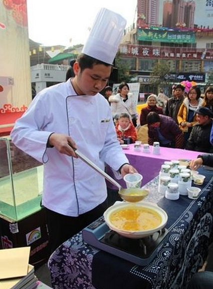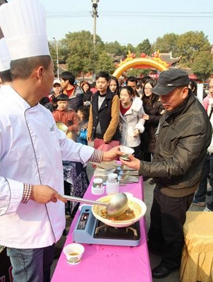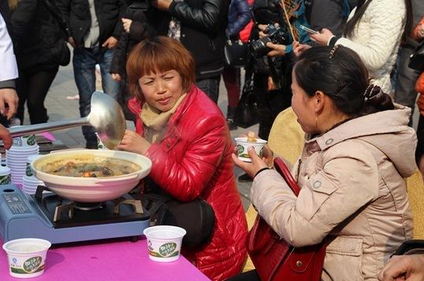 2月6日下午,在张家界市人民广场,三位厨师将做好的大鲵(俗称娃娃鱼,人工养殖的子二代)摆上餐桌,来往的人群纷纷排成三队,等着免费品尝人工养殖的娃娃鱼。 (来自:腾讯大湘网)