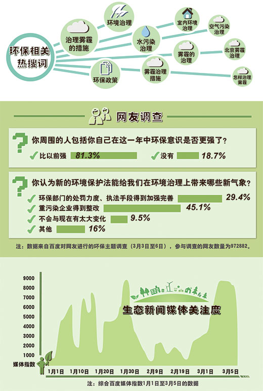污染源是否减产,洒扫能否到位,工地裸露土地的苫盖了吗……遇到空气质量不好的天气,各地环保监察部门都要把这些应急措施一项项落实。空气质量新标准发布以来,雾霾、PM2.5等本来十分专业的词汇已为大众熟知。搜索“环保”一词,百度页面超过1亿个。搜索指数显示,包括雾霾治理在内的环保问题成为百姓最大关切。两会期间,生态环保成为代表委员热议的一个话题,网络搜索量顺应百姓对良好生态环境的期待,正是环保的目标和任务。