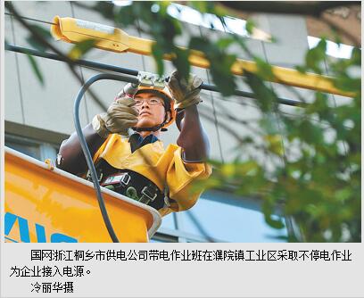 “想不到,供电部门可以带电检修送电,我们这里40多家企业就不用担心生产旺季停电了。”8月19日一大早,濮院镇工业园区永安路,桐乡市供电公司带电作业班顶着高温带电为园区企业接入电源,桐乡明智服饰有限公司负责人不禁竖起了大拇指。