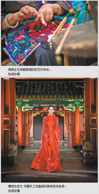入夜,北京恭王府红墙大院内,青石板上搭起T台。缱绻撩人的布依族浪哨中,云鬓香衣款款而来,“依文·永不遗失的绣梦”时装秀上的布依族刺绣惊艳全场。