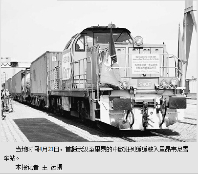 当地时间4月21日上午11时23分,伴随着欢迎人群的阵阵掌声,首列从中国武汉直达法国里昂的国际货运班列线路——“汉新欧”国际集装箱班列满载着货物,经过15天11300公里的旅途,缓缓驶入古丝绸之路西方端点城市——里昂韦尼雪货运站,圆满完成第一趟行程。