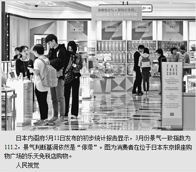 日本内阁府11日发布的初步统计报告显示,3月份经济景气一致指数为111.2,比前一个月微涨0.5,时隔两个月出现改善,但景气判断基调依然是“停滞”。