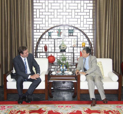 本刊讯8月13日,温振顺总领事邀请黑森州迪岑巴赫市市长约根·罗格到总领馆做客。迪市政府经济顾问诺尔伯特·凯恩、经促局局长米夏埃尔·克里驰、总领馆经济商务领事王卫东等在座。