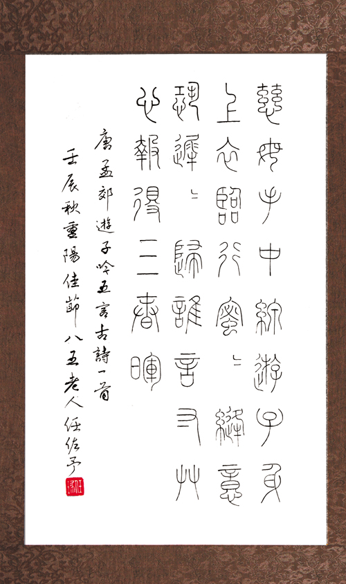 任琢佐予 八六年庚 祖籍宁波 现居申江 幼承庭训 学有所长 曾拜名师 忝列门墙 专攻艺文 不怠不荒 理论实践 相得益彰 印效秦汉 诗仰盛唐 书法魏晋 画近四王 年届弱冠 稍露锋芒 搦管写作 斗胆逞强 投寄拙稿 发表文章 数易寒暑 声名渐张 十年浩劫 砚毁笔伤 面壁图破 路走何方 偶逢甲骨 欣喜若狂 神往手追 前途康庄 四凶翦灭 日月重光 百废待兴 远景辉煌 纵观艺海 群情激昂 歌舞戏曲 丝管悠扬 生旦净丑 各擅胜场 弹唱说噱 众花飘香 一介儒流 年迈苍苍 太平盛世 试谱乐章 诗情画意 比翼飞翔 据案篆刻 分别阴阳 老骥披鞍 蹄奋鞭扬 廉颇未衰 岂畏刀枪 诗书画印 四轮奔忙 新构迭出 屡蒙厚赏 内外播报 遐迩传扬 师友致贺 举杯进觞 谬称泰斗 汗颜惶惶 名不副实 羞愧难当 短言三百 略述行藏