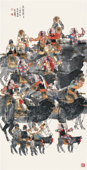 为表现高原人粗犷豪放的性格和藏族舞蹈震憾天地的气势,《高原之舞》开始画得比较粗犷,虽也画出了一定的感受,但总觉得粗糙不耐看,后来从方荣翔扮演李逵的艺术处理受到了启发。我在朝鲜战场看过方荣翔主演的《李逵下山》,他扮演的李逵粗野中颇具妩媚,甚至有些书卷气,李逵被方荣翔诗化了,粗野、妩媚矛盾的和谐丰富了李逵,增强了李逵的感染力和吸引力。高明的戏曲演员用背部的颤动,头簪的微抖来表现巨大的悲伤,实在比对着观众大嚎要来得有力。