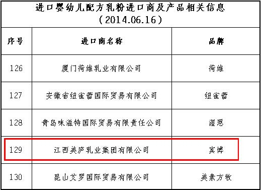 2014年6月16日,根据国办发[2013]57号文件要求,国家质量监督检验检疫总局进出口食品安全局公布了获注册批准的进口奶粉品牌及进口商信息。其中Bimbosan宾博在此公布名单中!