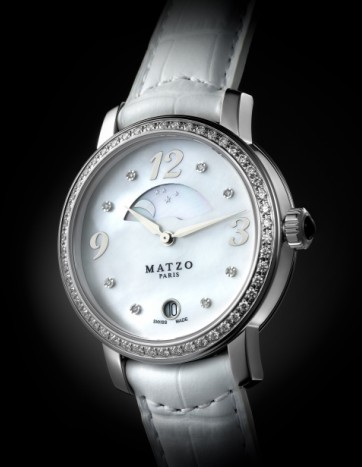 此款MATZO PARIS太空时尚系列“星际旅行”腕表,魅力无比、楚楚动人,专为女士手腕而设计。白金表壳,白色珍珠母贝表盘搭配光面白色鳄鱼皮表带,亮泽珍珠母贝表盘莹莹发光,宛如月光下的星空,独特的星月图设计就像一片具有吸引力的未知领域一样带给人们莅临时空的梦境感和无比浪漫的感觉,完美无瑕,稀世奇珍。56颗切工精细的优质美钻由工匠们用巴黎美爵MATZO PARIS特有的钻石镶嵌技术围绕在表盘周围,形成一圈闪烁夺目、奢华的光环。“星际旅行”腕表不仅彰显了巴黎美爵MATZO PARIS制表大师们的深厚功力,也为时尚艺术腕表开辟了前所未有的发展新方向。这只手表所具有的魅力远非仅仅局限于它独具创意的外观,在钟表领域不懈追求突破的巴黎美爵,在开创各种风格的同时,更始终维持着统一的最高技术水平。巴黎美爵MATZO PARIS太空时尚系列“星际旅行”腕表在理性设计中人文关怀的出发点,散发着瑞士特有的优雅和独具匠心,也不乏法国的温情和浪漫,已经日益成为欧洲年轻一代的腕上宠儿。