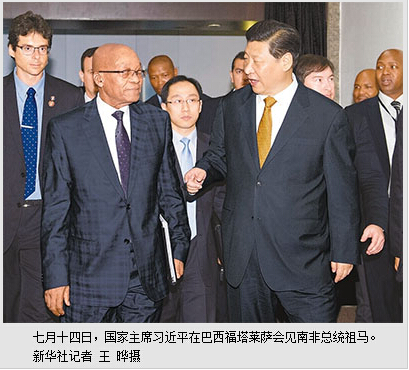 本报巴西福塔莱萨7月14日电 (记者杜尚泽、颜欢)当地时间7月14日,国家主席习近平在巴西福塔莱萨会见南非总统祖马。