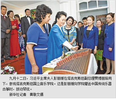 本报杜尚别9月13日电 (记者杜尚泽、林雪丹)12日上午,习近平主席夫人彭丽媛在塔吉克斯坦副总理贾博丽陪同下,参观了塔吉克斯坦国立音乐学院。 彭丽媛抵达音乐学院时,受到院长法罗嘉特热情迎接。学生们挥动中塔两国国旗,载歌载舞,夹道欢迎。走进教室,彭丽媛听取了塔吉克斯坦民族乐器介绍,欣赏了师生们演唱民歌、演奏传统乐曲。塔吉克斯坦民族歌唱家马赫马德古罗夫和中国留学生共同演唱了歌剧选段,歌唱家努鲁罗耶夫用中文演唱中国民歌,动人的旋律传递着对尊贵客人的美好祝福,悠扬的歌曲诉说着中塔两国人民的深厚情谊。 演出结束后,彭丽媛同师生们握手。彭丽媛表示,音乐是情感的艺术,是不需要翻译的语言,可以沟通不同民族的心灵和感情。希望中塔两国更多开展音乐交流,将友谊的旋律传唱下去。 彭丽媛向学院赠送了中国传统乐器和民乐唱片。