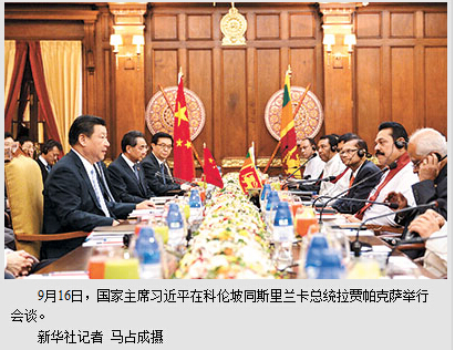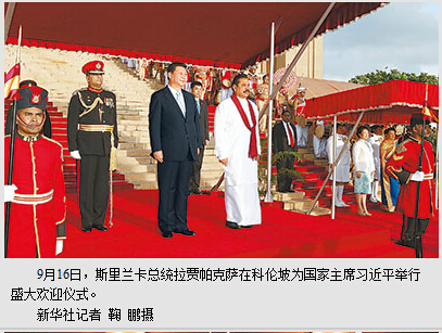 习近平指出,我们抵达斯里兰卡后,受到斯里兰卡政府和人民盛情欢迎。从机场到下榻宾馆沿途,斯里兰卡民众载歌载舞夹道欢迎我们。刚才,拉贾帕克萨总统为我举行了隆重欢迎仪式,令我们深受感动。