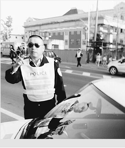 10月24日下午3点多,山东威海交警六大队的一名协警在303省道镇区段上,对停在草庙子小学外路边的车辆拍照贴罚单时,遭到现场接学生的众多家长的抵触。由于学校周边没有停车场,一些学生家长只能将车停在路边。协警用对讲机搬援兵。不一会儿,一辆警车斜插在路上,从车上下来5名交警,为首的一名交警未戴警帽,手夹一根香烟(如图),下车就说:“怎么了,怎么了,要干什么?”这样执法显然不符合《交通警察道路执勤执法工作规范》。
