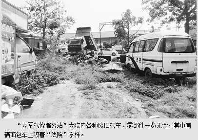 山西运城市万荣县修理街上的汽车修理厂十分混乱、隐患重重。5月10日我赴万荣,目睹了这一乱象。早上10时许,我首先来到一家名为“立军汽修服务站”,映入眼帘的是杂草丛生的大院,院中横七竖八停放着许多破旧车辆,其中一辆前后无牌、喷着“法院”字样的面包车十分惹眼;许多废旧零件及塑料壶、机油桶、废机油等易燃物品随意堆放着;一辆用帆布掩盖的加油车应该算该院最大的秘密和隐患。