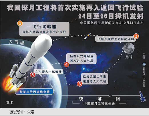 中国国防科技工业局新闻发言人22日宣布,中国探月工程将首次实施再入返回飞行试验,飞行试验器计划于24日至26日择机在西昌卫星发射中心发射。
