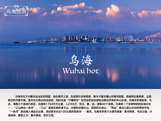 乌海物华天宝,人杰地灵,是一座古老而又年轻的城市,这里河湖纵横、山川耸立、沙漠连绵、草原辽阔,是集塞外豪放与水乡婉约于一身的户外运动首选之地。在1754平方公里的区域面积内汇集了河流、湿地、高山、草原和沙漠等地容地貌。乌海的国家级保护植物四合木被学术界誉为“活化石”,石炭纪硅化木被称为亚洲之最,距今5000年的桌子山岩画群被列入国家级重点文物保护单位。人文景观有成吉思汗雕像、古汉城遗址、古汉墓、满巴拉僧庙、明代长城烽火台等。乌海素有“黄河明珠”、“乌金之海”、“沙漠绿洲”、“葡萄之乡”、“书法之城”、“赏石之城”之美誉,它完美的诠释了乌海的地理和人文环境。随着国家重点工程黄河海勃湾水利枢纽工程的建成,一个118平方公里的“乌海湖”正在形成,已构成依山傍水、沙水相连、特色鲜明的独特风景,形成城在水中,河在城中景观,使乌海真正成为黄河金腰带上的明珠;乌海在北纬39度线上,水土光热资源丰富,适合葡萄种植,现有120多个品种,多个葡萄品种、葡萄酒荣获国际、国家级奖项,“乌海葡萄”地理商标已成功注册;随着高88.95米的甘德尔山成吉思汗雕像的即将建成,届时将打破多项吉尼斯纪录;乌海是“中国书法城”、“中国硬笔书法名城”、“中国赏石之城”,建成了国内单体面积7.6万平方米最大的当代中国书法艺术馆,成功举办了七届国际书法产业博览会。乌兰布和沙漠、库布其沙漠和毛乌素沙地交汇在这里,近年来乌海下大力气构建绿洲型山水园林宜居环境,被评为全国绿化模范城市和国家园林城市。