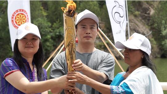 中国印度友好协会副秘书长刘宏敏女士(左一)、印度驻华大使馆文化参赞瓦娜佳德卡特女士(右一)以及中国国际太极•瑜伽大会秘书长林晓海先生(左二)共同点燃了象征太极与瑜伽的火炬