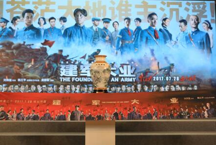 献礼建军90周年热血战争巨制《建军大业》24日在京举行盛大首映红毯和观影活动,主创导演刘伟强、总策划兼艺术总监韩三平、监制黄建新携演员刘烨、朱亚文、黄志忠、欧豪、刘昊然、马天宇、张艺兴、董子健、霍建华、张天爱、释小龙等31位演员盛装出席,史无前例的阵容令现场观众为之沸腾。同时,电影官方独家授权艺术品《盛世江山》特制珍藏瓷也震撼亮相会场,首开文化收藏先河,助力燃情建军。