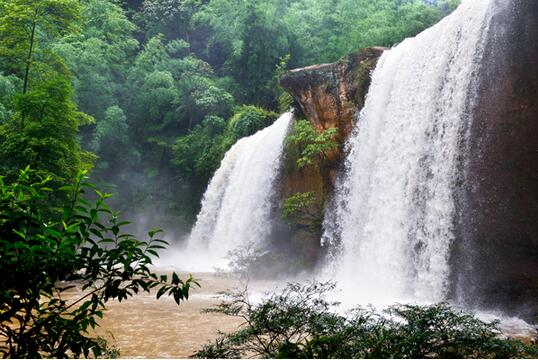 月亮潭瀑布:宽42米、高10米,远看秀美得如一把向下的弯形银梳。