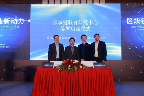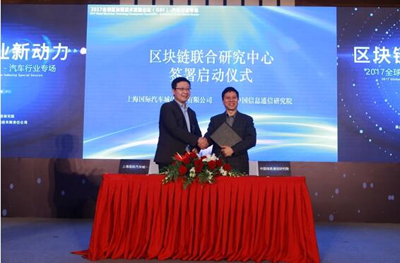 中国信息通信研究院(以下简称“中国信通院”)与上海国际汽车城(集团)有限公司(以下简称“上海国际汽车城”)共同设立的区块链联合研究中心正式成立。2017年11月8日,在由嘉定区上海国际汽车城管理委员会、中国信息通信研究院共同主办的全球区块链技术发展论坛(GBF)——汽车行业专场活动上,中国信息通信研究院何桂立副院长与上海国际汽车城(集团)有限公司曹光宇副总经理代表双方正式签署了合作协议。工信部信软司李瑛处长、上海国际汽车城(集团)有限公司荣文伟董事长现场进行了见证。