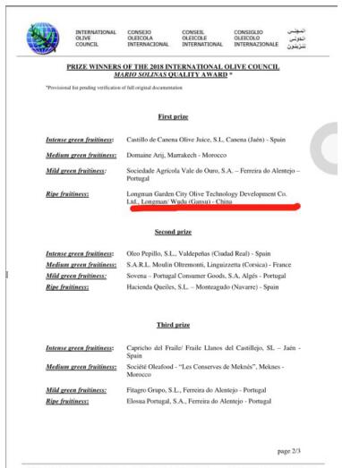 在2018年4月3日西班牙马德里结束的国际油橄榄理事会橄榄油官方评比中,来自中国陇南田园油橄榄科技开发有限公司的橄榄油在全球多个国家,189个参赛油品中脱颖而出,荣获一等奖一一马里奥•索利纳斯奖!成为了获得这一国际橄榄油品质最高奖项的首款中国橄榄油。