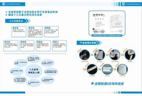 该仪器采用量子点荧光技术全面检测毛发中吗啡、甲基安非他明、氯胺酮、可卡因、大麻等5种常见毒品,以后根据禁毒工作需要,随时增加检测毒品种类,该仪器检测速度、灵敏度、特异性、均一性等性能均达到甚至超过国际标准,并制定了吗啡、甲基安非他明、氯胺酮三项毛发毒品荧光定量检测试剂盒的行业标准,申请了3项国家发明专利,5项实用新型专利,2项软件著作权,2项外观专利,具有操作简便、快速、精确等优点,能满足基层公安民警及非专业人员使用。