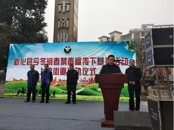 1月26日,新化县今冬明春禁毒宣传下基层活动上渡街道启动仪式在唐家岭社区沃尔玛广场举行。县政府办副主任、县禁毒委员会副主任、县禁毒办主任陈锡光、县禁毒协会会长邹秉卿、上渡街道党工委书记段智洪、办事处主任陈望林等相关领导出席。上渡街道全体机关工作人员、各村(社区)主职干部、社会禁毒志愿者共三百余人参加,启动仪式由县政法委副书记、综治办主任潘飞星主持。