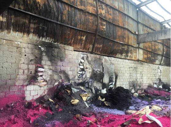 一墙之隔,失火的一边机器物资化为灰烬,房顶钢梁烧融变形