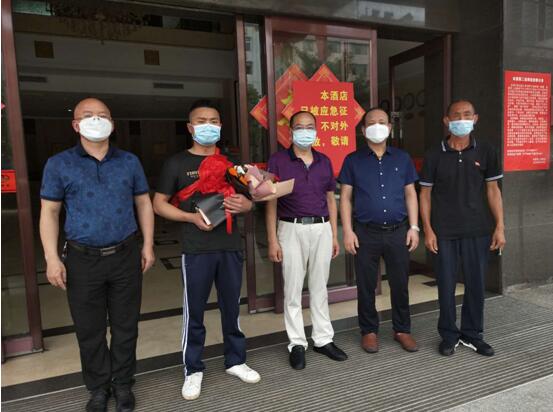 6月10日,新化县防疫指挥部、卫健局、上渡街道社区卫生服务中心相关领导及炉观镇疫情防控指挥部人员来到鸿宇大酒店门口,将一束鲜花送到刚刚解除医学观察的最美志愿者邹智明手中,感谢他不顾个人生命健康安危,只身前往吉林舒兰市再度当志愿者,支援舒兰人们战“疫”,被舒兰市授予“最美志愿者”称号。
