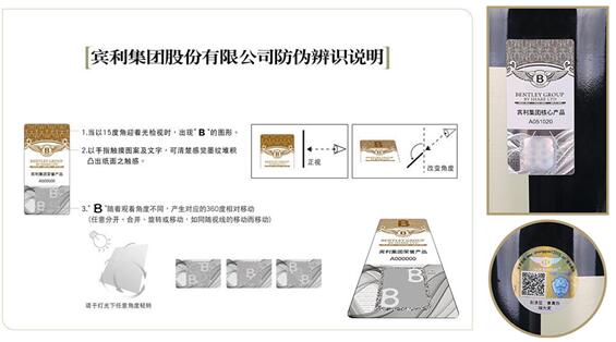 宾利葡萄酒防伪标贴使用的防伪技术来自钞票印刷,该技术是全球少数同时拥有雕刻凹印制程及微纳米全像制程的防伪技术,是保密技术。从瓶身出发,拿起宾利爵卡葡萄酒瓶身,以15度角迎光检视时,出现B的字母,其字母寓意着财源广进、发大财。迎着光,随着字母B的观察角度不同,会产生对应的360度相对移动。再用手指轻触瓶身中的图案及文字,可清楚的感受到墨纹堆积凸出纸面的触感。与此同时,在宾利葡萄酒的瓶身上都有各自的身份证和流通档案记录,有效地保证了产品的安全。由此,防伪独一无二,堪称钞票的防伪级别,最终保障了每一位消费者的权益。