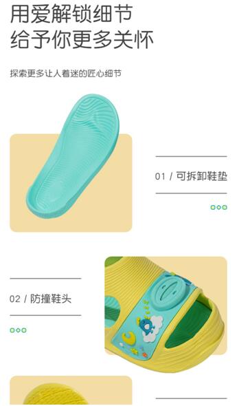 它专注于国内童鞋市场的中、高层消费者,产品均采用高环保EVA材质,无毒、轻盈、防臭,在保护粉嫩嫩的小脚丫同时,孩子们的每一步都是无比地舒适与轻盈。