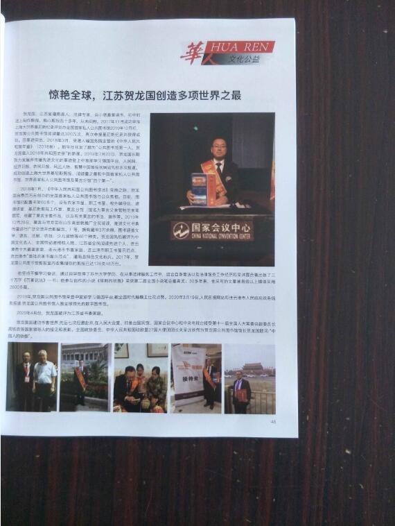 今天,从香港传出消息:由中国香港特别行政区政府主管、世界华人文化传媒集团主办的中国面向全球华人的主流杂志-----《华人》正式出版,江苏省灌南县田楼镇居民贺龙国创造多项世界之最,与中国工程院院士、抗疫英雄、全国最美奋斗者、共和国勋章获得者钟南山当代中国的匠心精神感人事迹一起荣登。