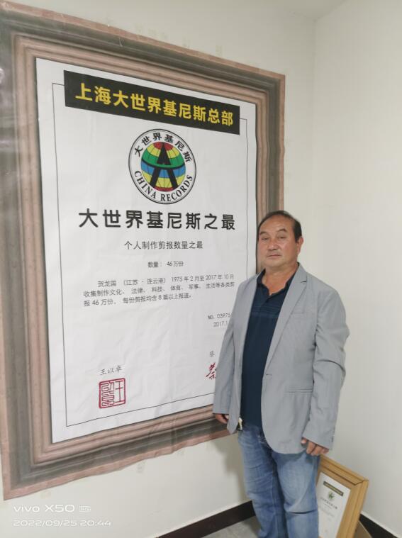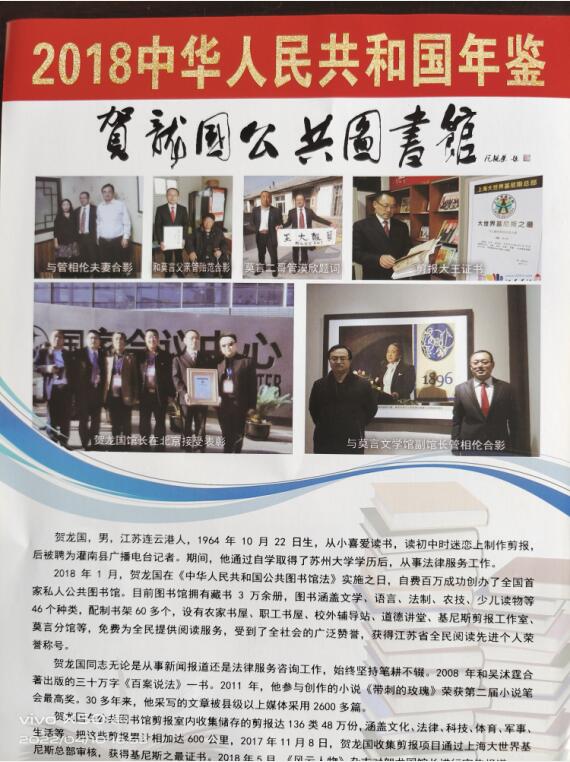今年59岁的贺龙国,是江苏省灌南县田楼镇三兴社区普通居民。他从小喜爱读书,初中时开始迷上剪报,到如今,46年初心不改、从未间断。步入社会工作后,贺龙国将读书阅报学习作为最爱,并于1994年创办了灌南县首家留守儿童、留守老人书屋。2018年1月,在县镇两级人大和文化部门的支持下,他积极报名参与“热爱灌南 奉献家乡”主题行动,投入百万元创办全国首家私人公共图书馆,采取免费开放、免费普法、免费借阅、免费送书上门以及信息资源共享的“四免一共享”模式,为当地群众以及周边省市县的文学爱好者提供阅读和文化交流场所,推广全民阅读,传播乡村书香文化。目前,贺龙国公共图书馆面积从刚开始的10多平方米扩展到300平方米,配置书架60多个,设有农家书屋、职工书屋、校外辅导站、道德讲堂、基尼斯剪报工作室、莫言分馆等。收藏科普、法律、文学、少儿读物等各类图书3万余册,剪报50多万份。40多年来,贺龙国收集制作的剪报以及图书馆阅读点击量获得上海大世界基尼斯两项纪录。