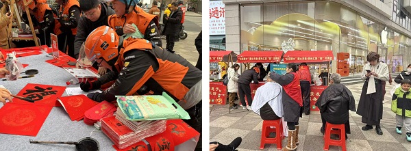 暖心市集专区暖意融融。四川楹联协会等5家单位的志愿者现场“送福”,书法爱好者挥毫泼墨,为新就业群体免费定制春联、福字,笔墨间承载着浓浓的新春祝福;专业美发机构提供的公益义剪服务,解决了新就业群体因工作繁忙无暇打理形象的难题;红领友好企业摊位前,大米、花生油、保暖手套、春见礼盒等慰问礼品整齐摆放,为参与者送上实用关怀;政策咨询专区内,街道工作人员与志愿者耐心解答社保缴纳、子女入学、租房补贴、权益维权等疑问,发放政策宣传手册,确保政策红利精准触达。